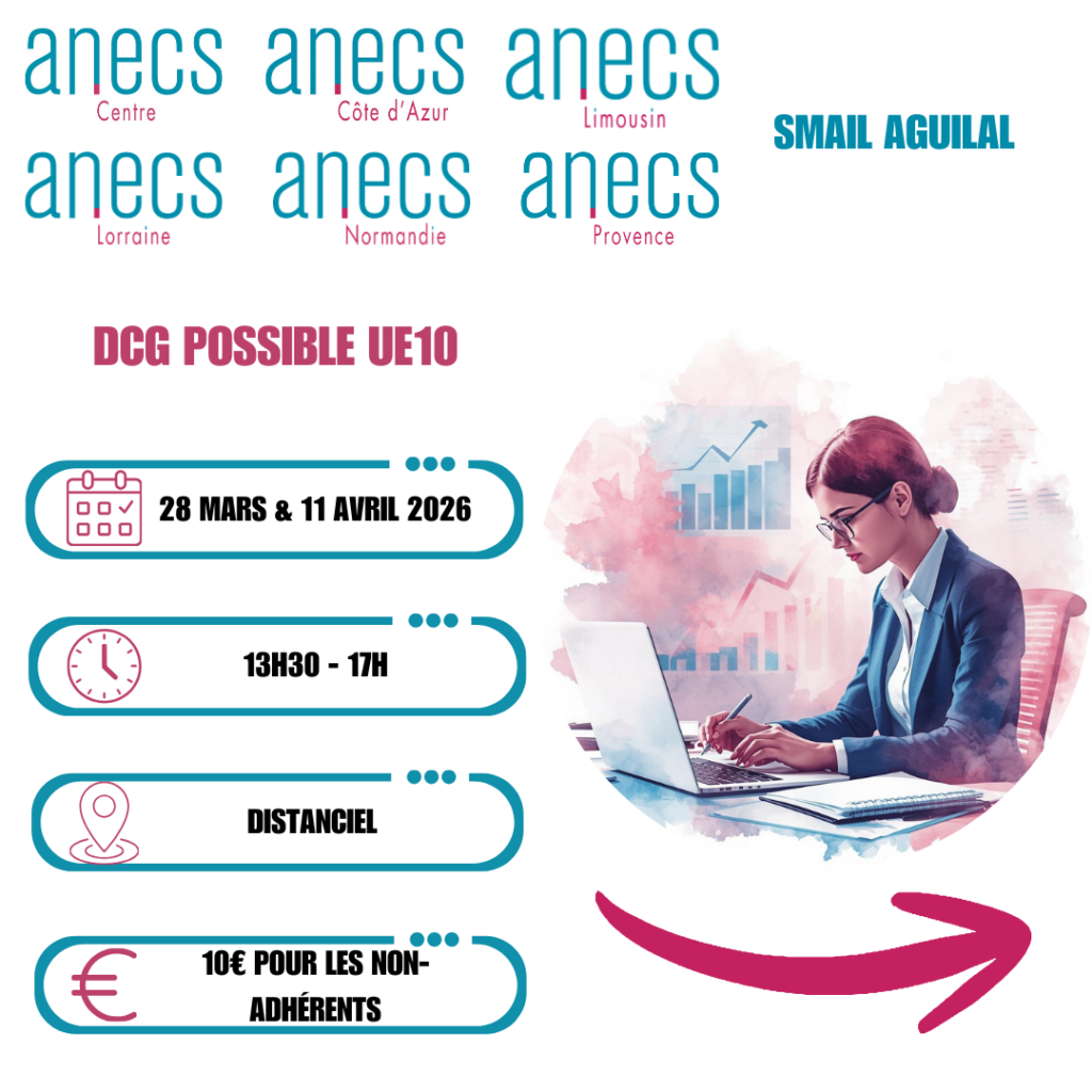 L’ANECS Centre vous propose deux sessions de révision dédiées au DCG Possible – UE10 (Comptabilité approfondie) pour consolider vos connaissances, clarifier les points techniques et maximiser vos chances le jour J.
