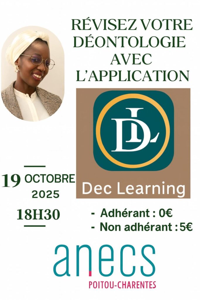 Bonne nouvelle 🎉 : ta section ANECS Poitou-Charentes t’invite à une visio dédiée à l’utilisation de l’application DEC Learning, un super outil pour réviser ta déontologie efficacement !