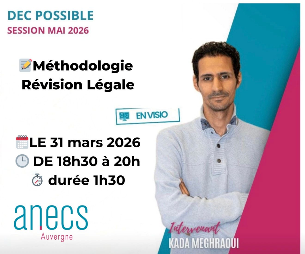 Dans le cadre de la préparation au DEC – session de mai 2026, le bureau de l’ANECS Auvergne vous propose une session dédiée à la méthodologie de l’épreuve de révision légale 📚