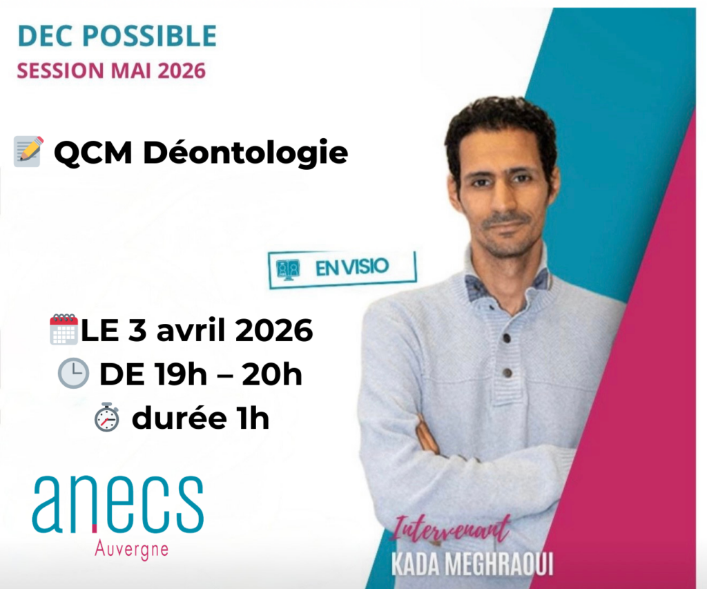 Dans le cadre du programme DEC Possible, l’ANECS Auvergne organise une session dédiée au QCM de déontologie, afin de vous accompagner dans la préparation de cette épreuve essentielle du DEC.