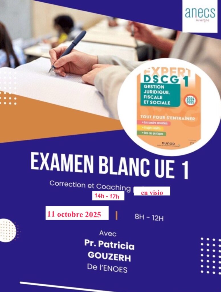 Un examen blanc, avec correction est organisé avec Patricia Gouzerh, enseignante en DCG, DSCG et MASTER CCA 1 et 2 à l’ENOES, l’école de l’expertise et de l’audit à Paris et ce depuis presque 20 ans. Elles est également animatrice de séminaire intensif en préparation du DSCG UE1 auprès des grands cabinets et de coaching training individuel et collectif pour les épreuves écrites du DSCG UE1.