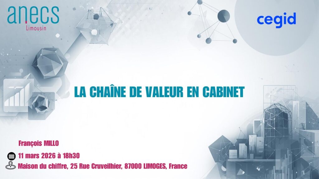 Pour ça, l’ANECS Limousin vous propose une soirée d’échange (en partenariat avec CEGID) autour d’un thème très concret : la chaîne de valeur en cabinet.