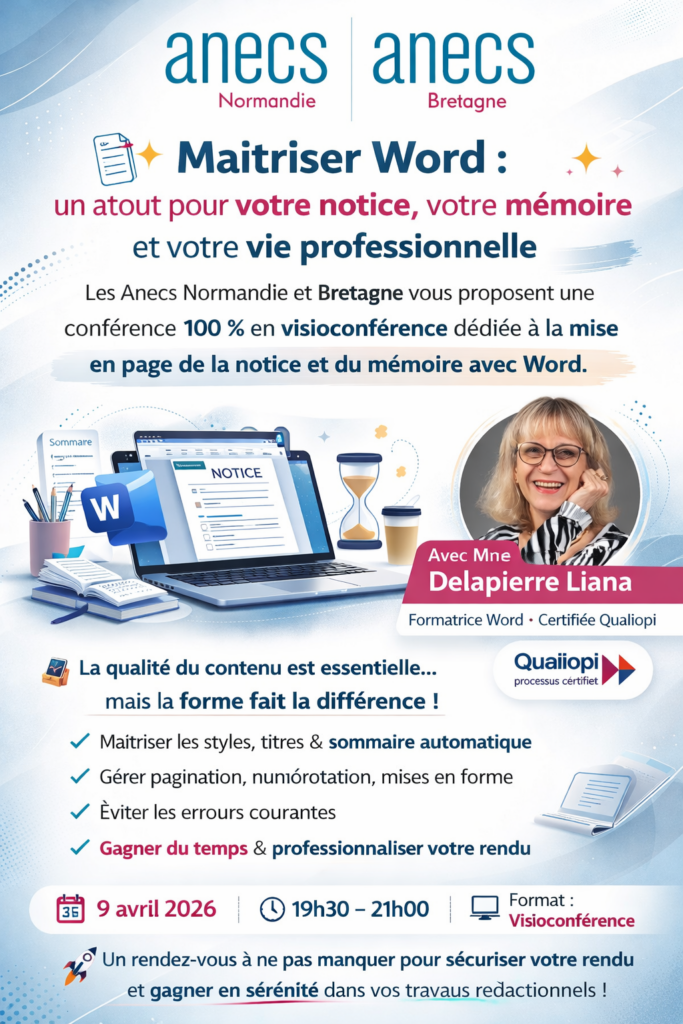 Les Anecs Normandie et Bretagne vous proposent une conférence 100 % en visioconférence dédiée à la mise en page de la notice et du mémoire avec Word.