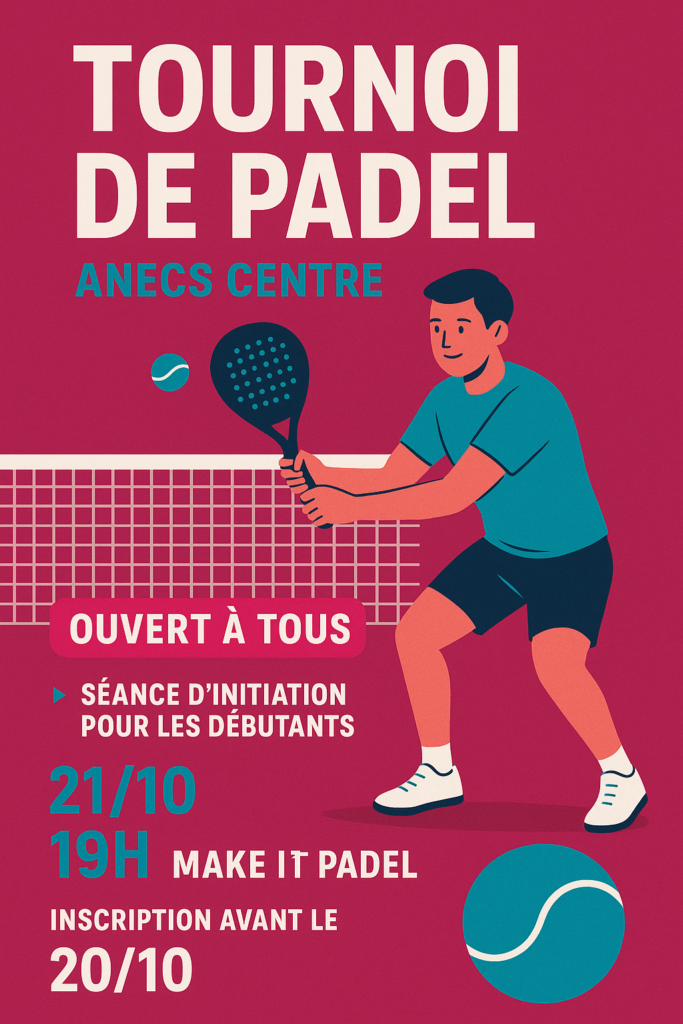 L’ANECS Centre a le plaisir d’organiser son premier tournoi de padel, un moment sportif et convivial placé sous le signe de la cohésion et de la bonne humeur !